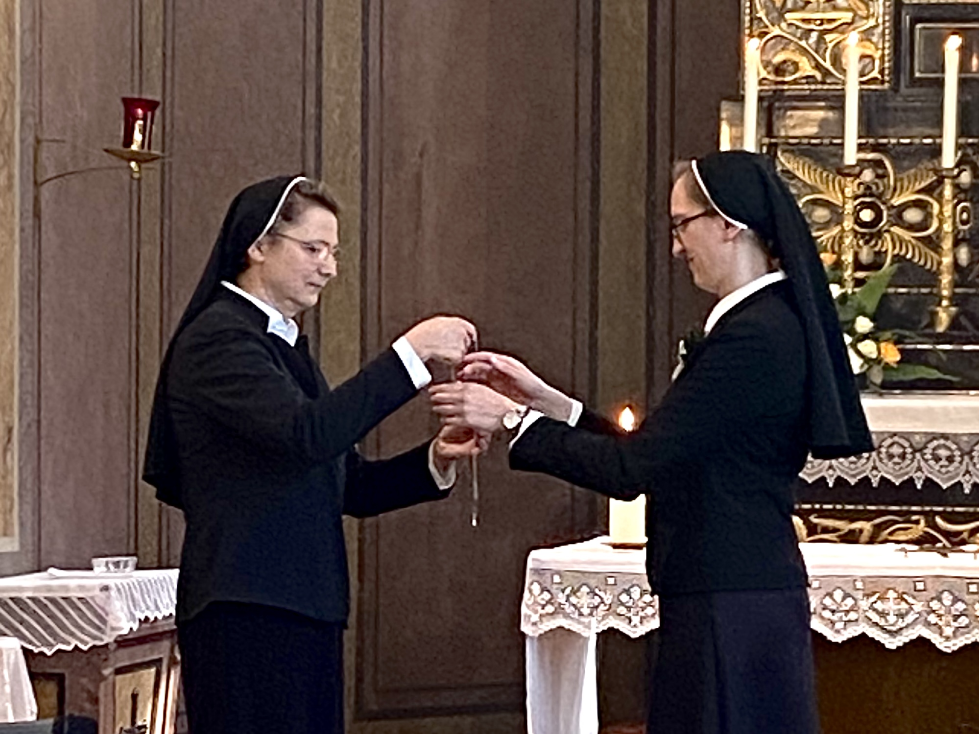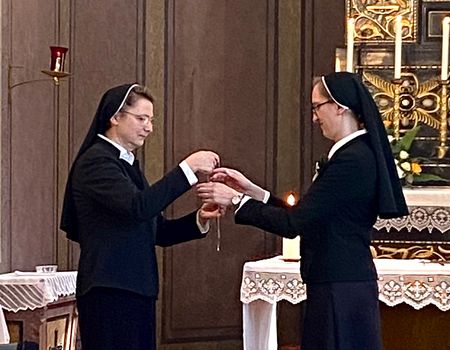 Es folgte die Professablegung, durch die Sr. Jana und die Schwesterngemeinschaft eine wechselseitige Bindung eingingen. Sr. Jana wurden von der Provinzleiterin verschiedene Zeichen überreicht: der schwarze Schleier, das Professkreuz, die Satzungen der Kongregation, die Hl. Schrift und die brennende Professkerze als sichtbares Zeichen ihrer Zugehörigkeit zur Gemeinschaft, zu Jesus Christus und zum Dienst in seiner Kirche. Das wichtigste Professzeichen für die Kongregation ist das Kreuz. Dort ist der Gekreuzigte als Auferstandener dargestellt. Mit dem Tragen dieses Kreuzes, trägt jede einzelne Schwester das Zeichen in die Welt, dass der Weg mit dem Auferstandenen durch jeden Tod zum Leben in Fülle führt.