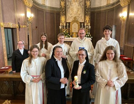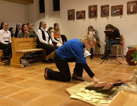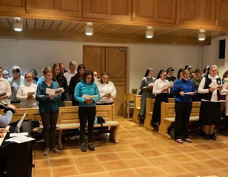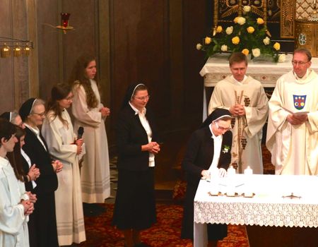 Der Singkreis „Lumen“ aus Burgkirchen am Wald gestaltete die Feier musikalisch lebendig mit. Bei der schwungvoll gesungenen Allerheiligenlitanei wurden die Feiernden spürbar mit hineingenommen in die Schar aller Heiligen. Danach legte Sr. Maria Falter ihre Ewigprofess in die Hände von Provinzoberin Sr. Marika Wippenbeck ab.