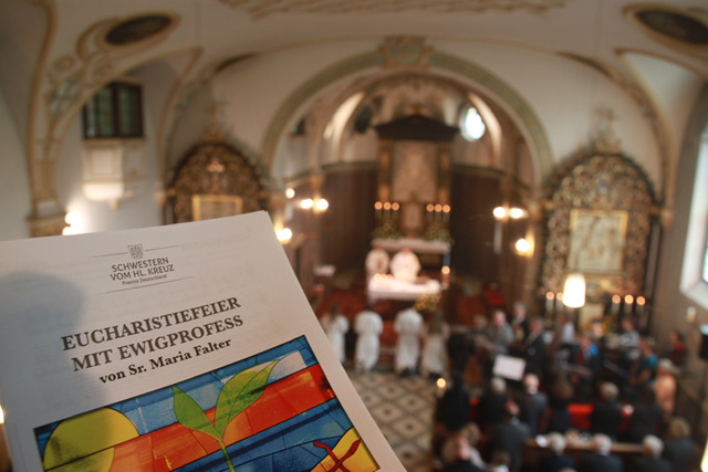 Dem Festgottesdienst stand Dr. Franz Haringer, Ordensreferent des Bistums Passau, vor. In seiner Predigt zum Osterevangelium, bei dem Maria von Magdala vom Auferstandenen beim Namen genannt wird (Joh 20,17), zog der Ordensreferent die Parallele zu Sr. Maria: „Wer immer ein Leben in der engeren Nachfolge Christi führen möchte – so wie heute Sr. Maria –, der hat bestimmt solche kostbaren Momente erlebt: Mein Suchen geht nicht ins Leere; ich bin gerufen mit Haut und Haaren, mit meinem Namen; nichts ist mehr wie vorher, wenn ich einmal erahnt habe, dass das Leben und die Liebe Jesu Steine sprengen kann und so immer aufs Neue Aufbrüche ermöglicht.“